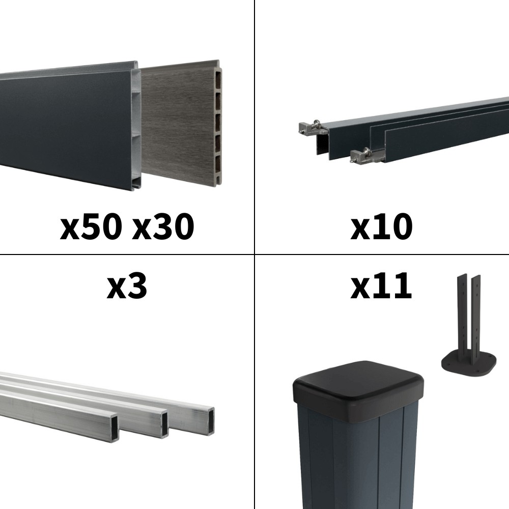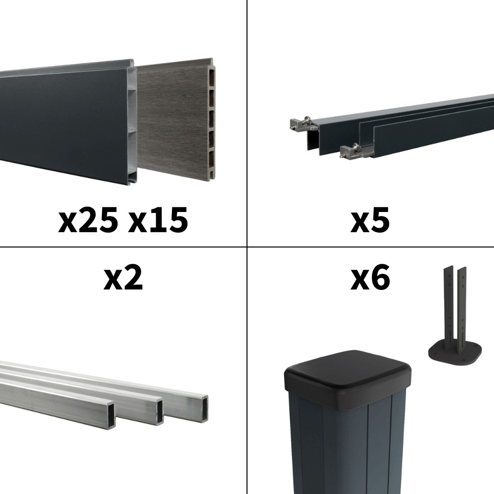 Le kit clôture aluminium poteau sur platines - BAHIA & CRUZ Ardoise H-1,2m est la solution idéale pour une clôture sur muret à la fois moderne et durable. Ce kit clôture aluminium et composite inclut tout le nécessaire pour une installation sur mesure de 5,53 à 18,27 m :