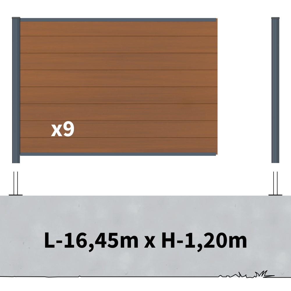 Le kit clôture composite poteau sur platines - CRUZ Teck H-1,2m fournit tous les éléments essentiels pour créer une clôture sur muret personnalisée de 5,53 à 18,27m :