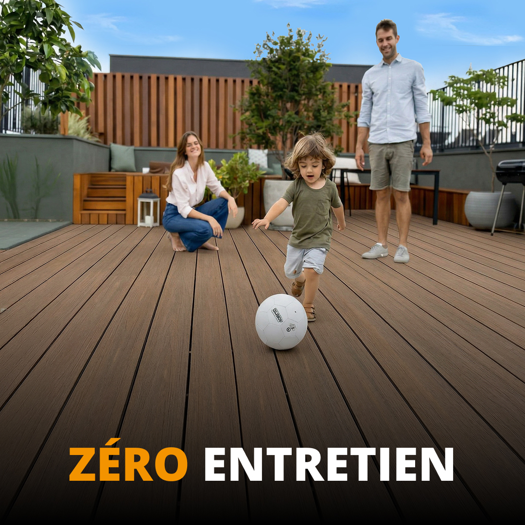 - Peu d'entretien : un nettoyage régulier à l'eau claire suffit pour maintenir l'apparence neuve de votre terrasse, sans nécessité de traitements chimiques fréquents.